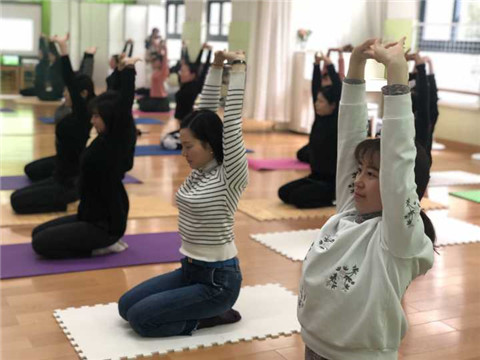 活动中,瑜伽老师的带领下进行了瑜伽体验活动。老师们在安静、放松的状态中学习呼吸、学习自我减压,帮助自己消除工作所带来的紧张情绪。在练习的过程中,老师们充分享受着活动所带来的身心愉悦的体验,并从中感受到了健康的重要性。