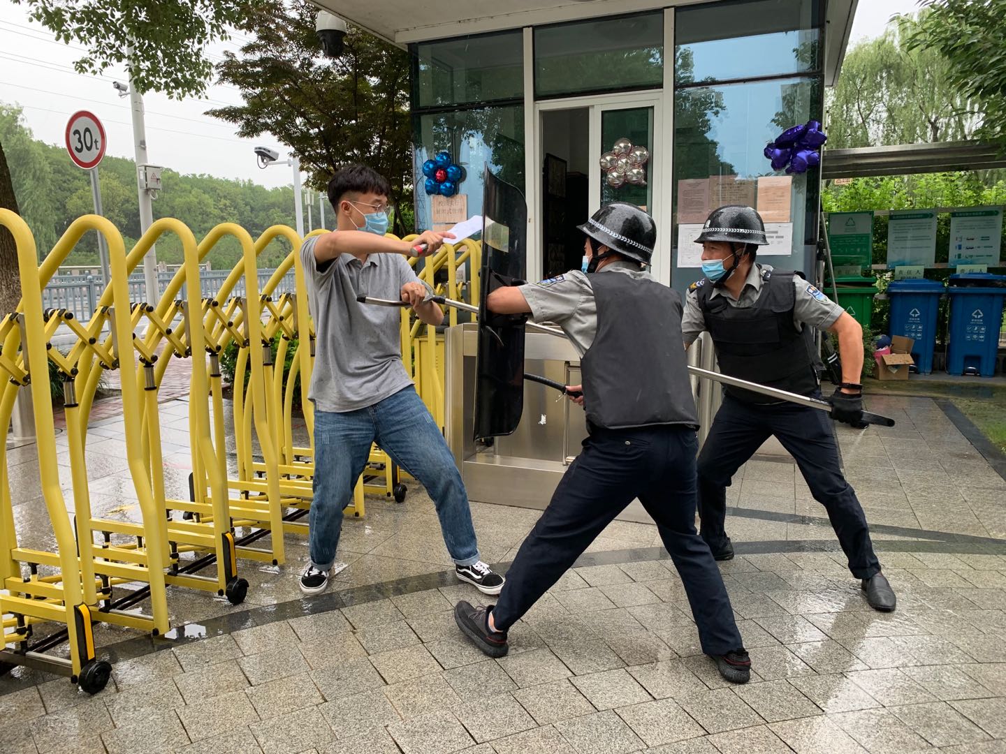 上午十点,一名校外不明人员欲强行闯入校园,该人员不服劝阻且拔出随身携带的管制刀具相威胁,保安人员迅速作出反应: